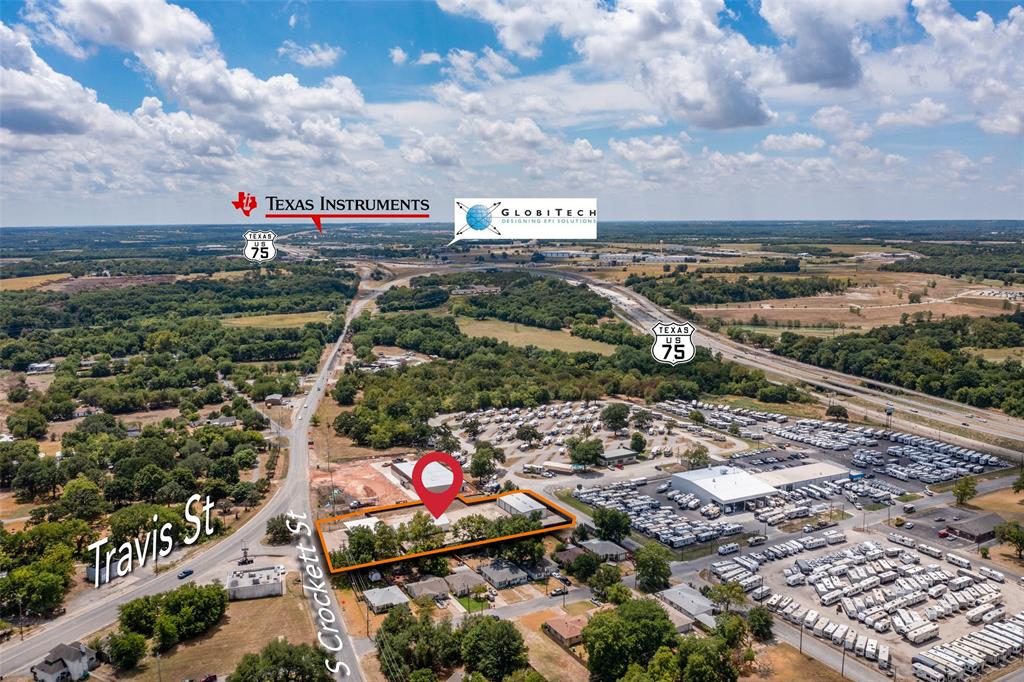 This fully renovated property includes three separate buildings totaling over 8200 SF on 1.2 acres parcel adjacent to the newly constructed Dollar General on S. Travis near US 75. 2010 S Crockett is located at the intersection of Crockett and Travis. It is 2415 SF haydite block-steel beam building with 10′ of clear HVAC space. Property includes ample parking and is ideally suited for retail or office. 2022 S Crockett is located directly behind 2010 and includes two metal buildings, approximately an acre of graveled yard, and is surrounded by a new 8′ wood fence with a 17′ rolling gate. The east building totals 3349 SF with 16′ clear and four 12′ rollup doors. The west building totals 2575 SF with roughly 1000 SF of HVAC office-assembly space, and roughly 1500 SF of 11′ clear warehouse-storage. The property is located .25 mile from US 75 with north-south access, and within 5 miles of Texas Instruments. Owner will sell together or separately.